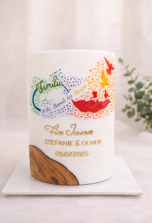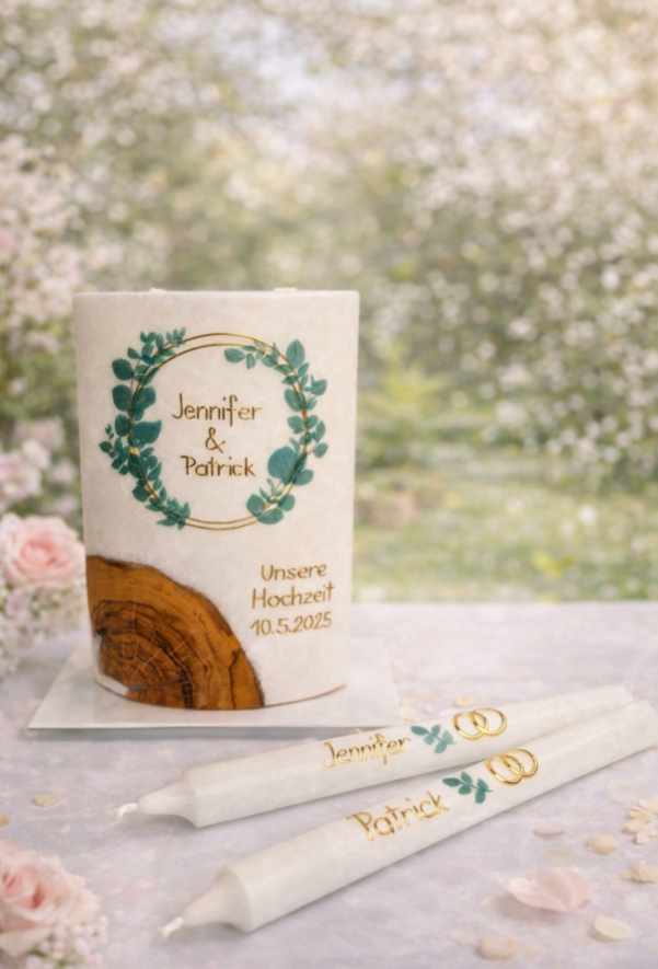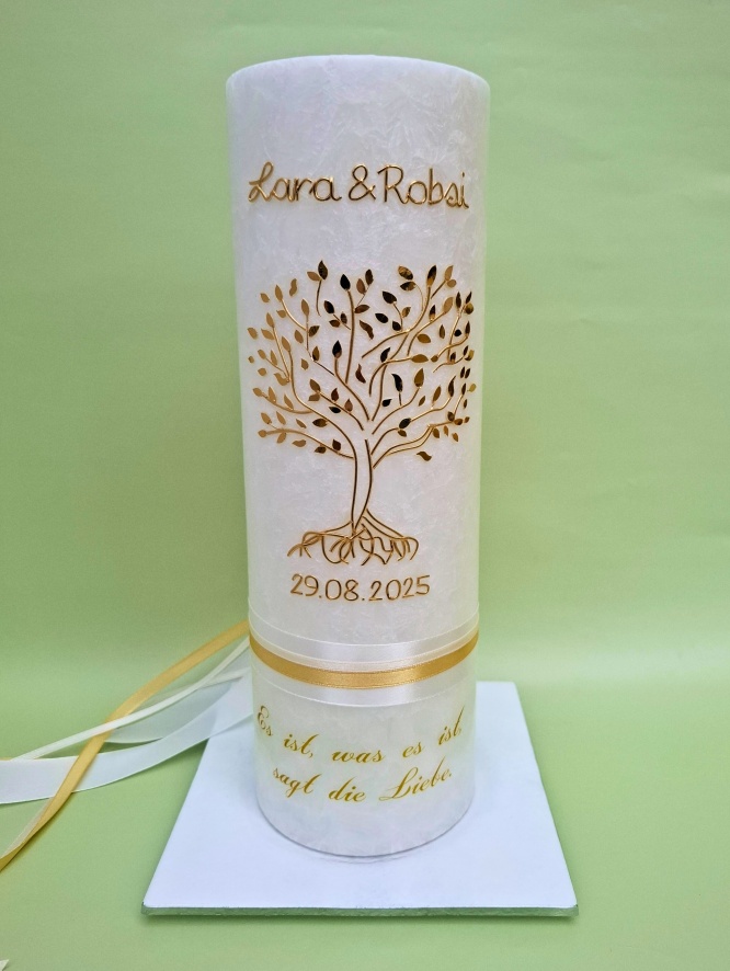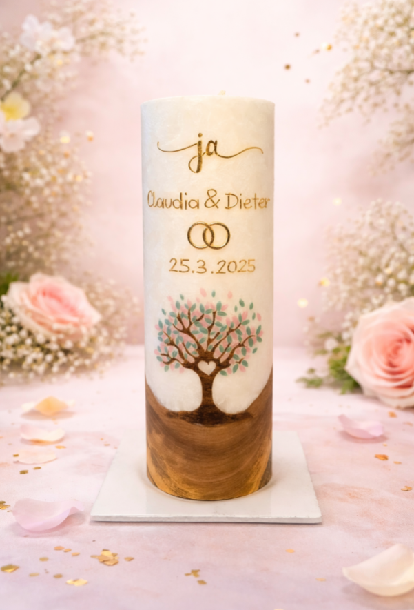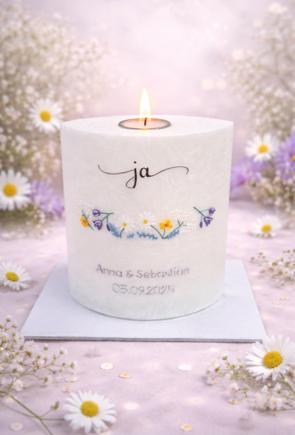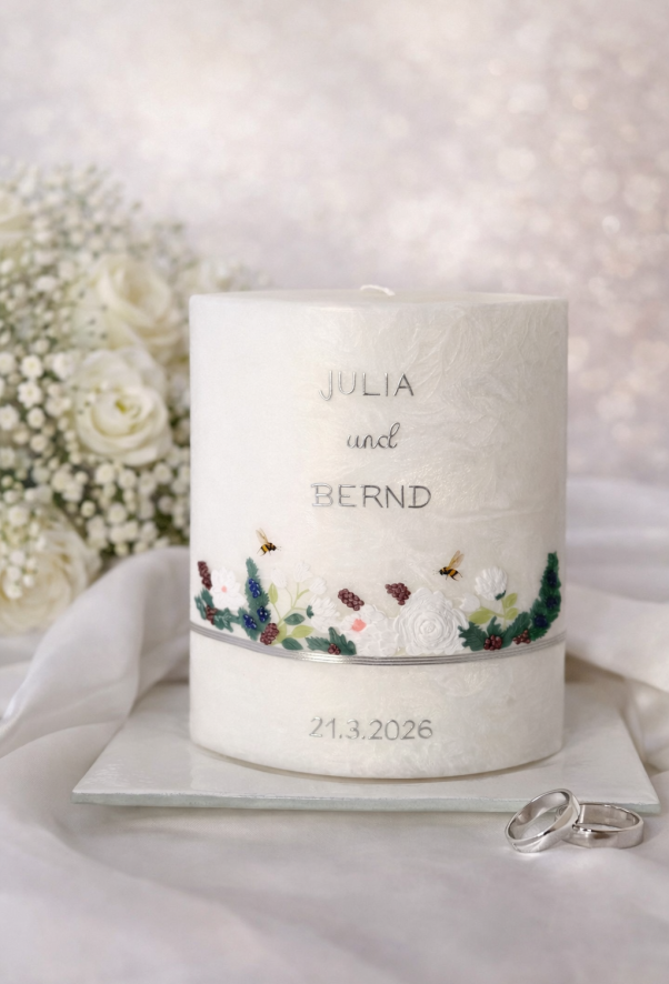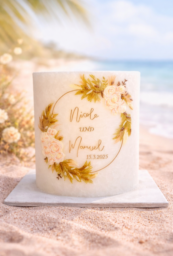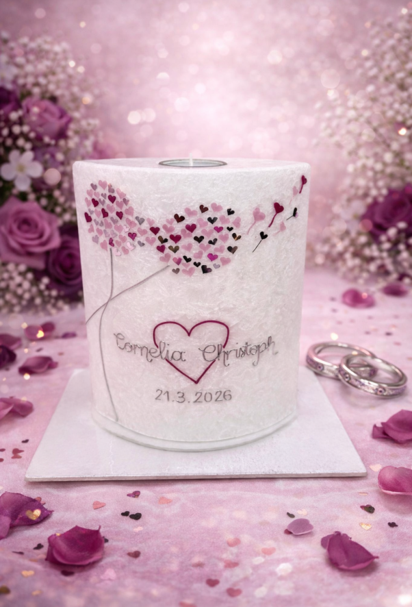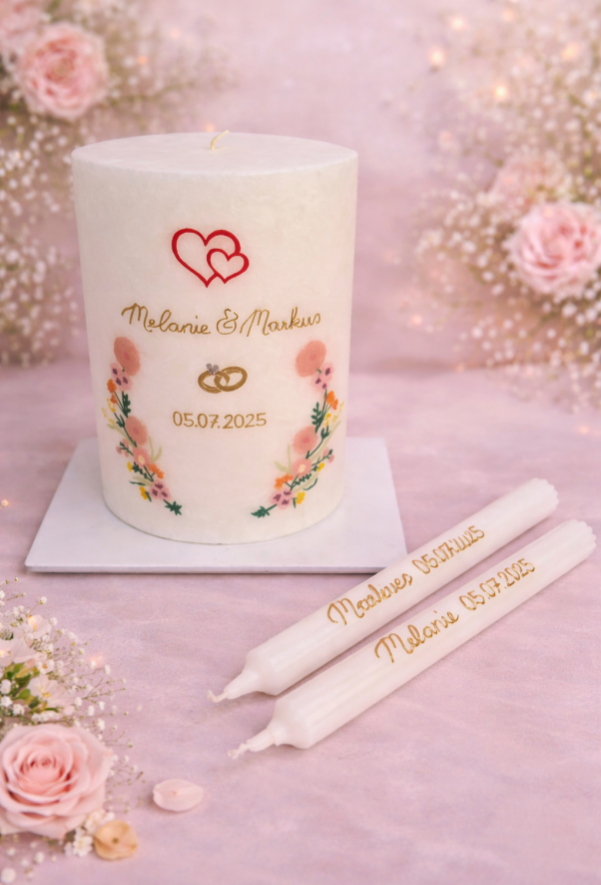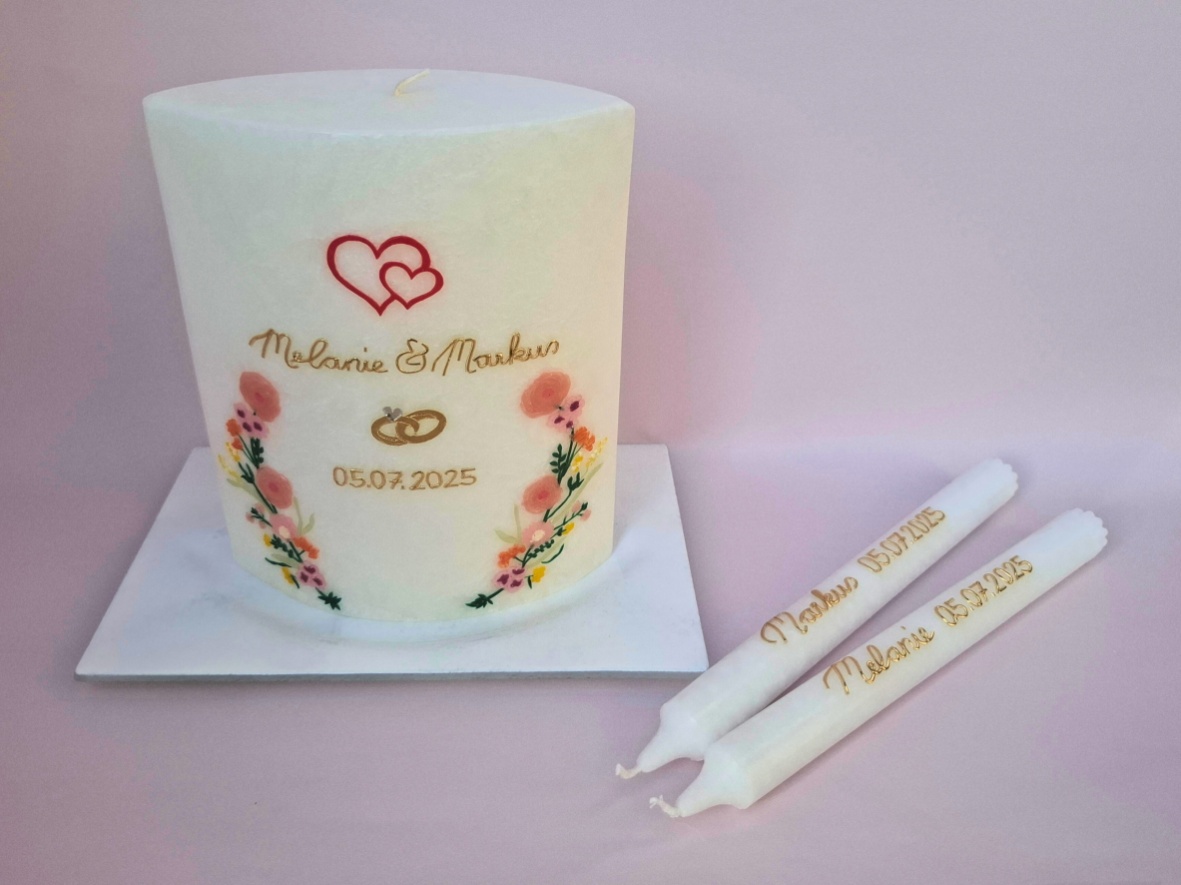 Ihr seid ein bezauberndes Paar, das voller Liebe ist und den Wunsch hat, den Bund fürs Leben zu schließen? Dann seid ihr bei mir richtig, eure Hochzeitskerze in einem einzigartigen Stil gestalten zu lassen!